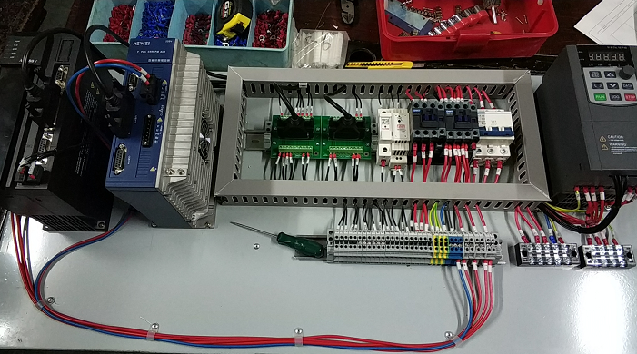 調直切斷機系統用到了電子凸輪運動功能,主流系統控制方案為觸摸屏、運動控制器、送料伺服、飛剪伺服。 科威智能伺服集伺服驅動、PLC控制、運動控制于一體,正好適用于調直切斷機系統??仆悄芩欧{直切斷機系統方案為觸摸屏、飛剪智能伺服、送料智能伺服。